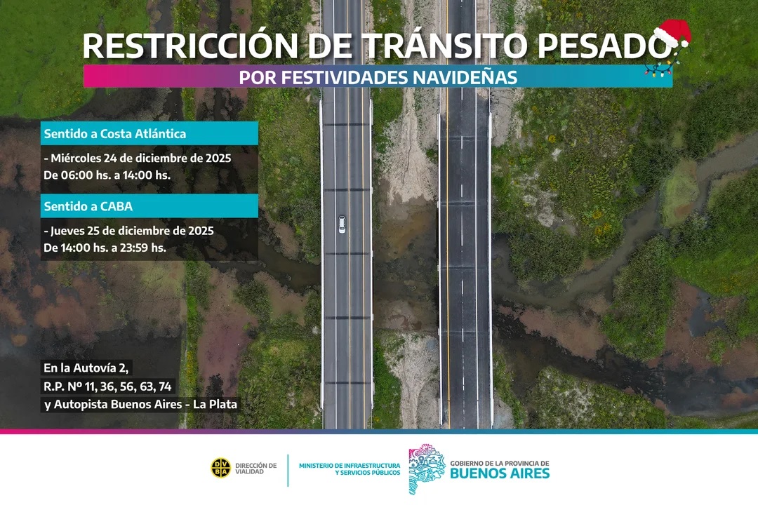 Según informaron las autoridades pertinentes al área, la circulación de camiones con carga de más de siete toneladas de porte bruto se verá impedida de transitar los días miércoles 24 de 06:00 a 14:00 horas hacia la Costa Atlántica y jueves 25 de 14:00 a 23:59 horas hacia la Ciudad de Buenos Aires.