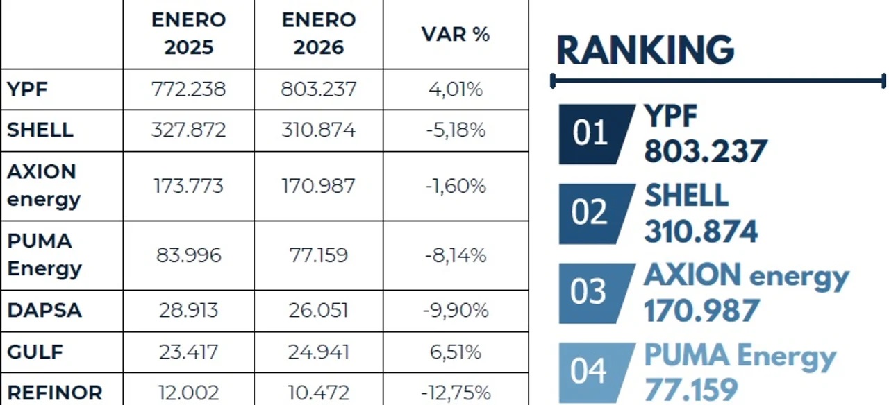 Buenos Aires, 26 febrero (NA) – La venta de los combustibles repuntó mínimamente en enero respecto a diciembre de 2025, pero el leve ascenso resulta positivo a la hora del análisis. YPF, la petrolera nacional, fue la que marcó el rumbo en ventas e impulsó al mercado.