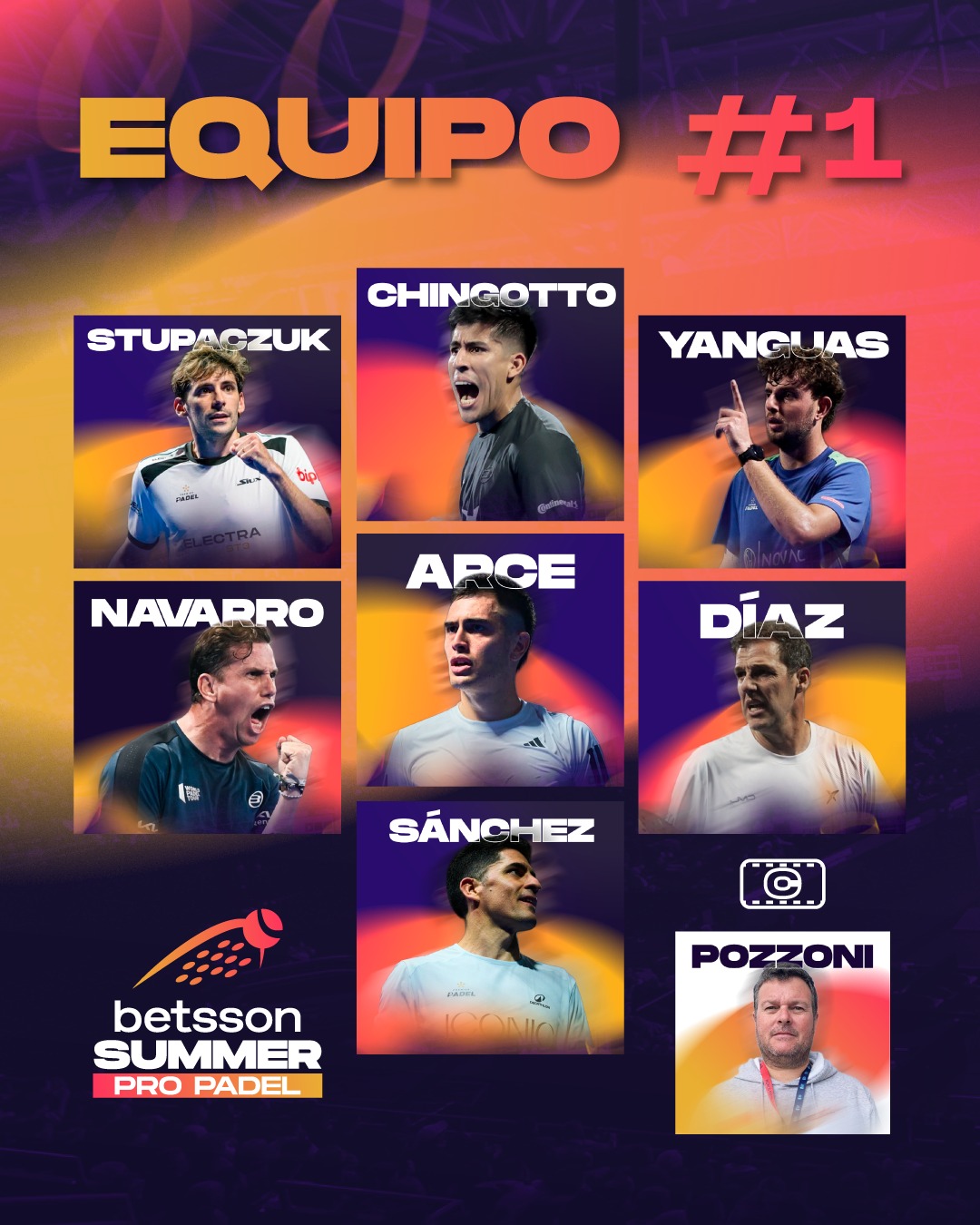 Equipo #1 (capitán, Carlos Pozzoni): Federico Chingotto (número 3 del mundo), Franco Stupaczuk (N° 5), Miguel Yanguas (N° 7), Francisco “Paquito” Navarro (N° 11), Maximiliano Sánchez (N° 35), Maximiliano Arce (N° 83) y la leyenda Juan Martín Díaz.